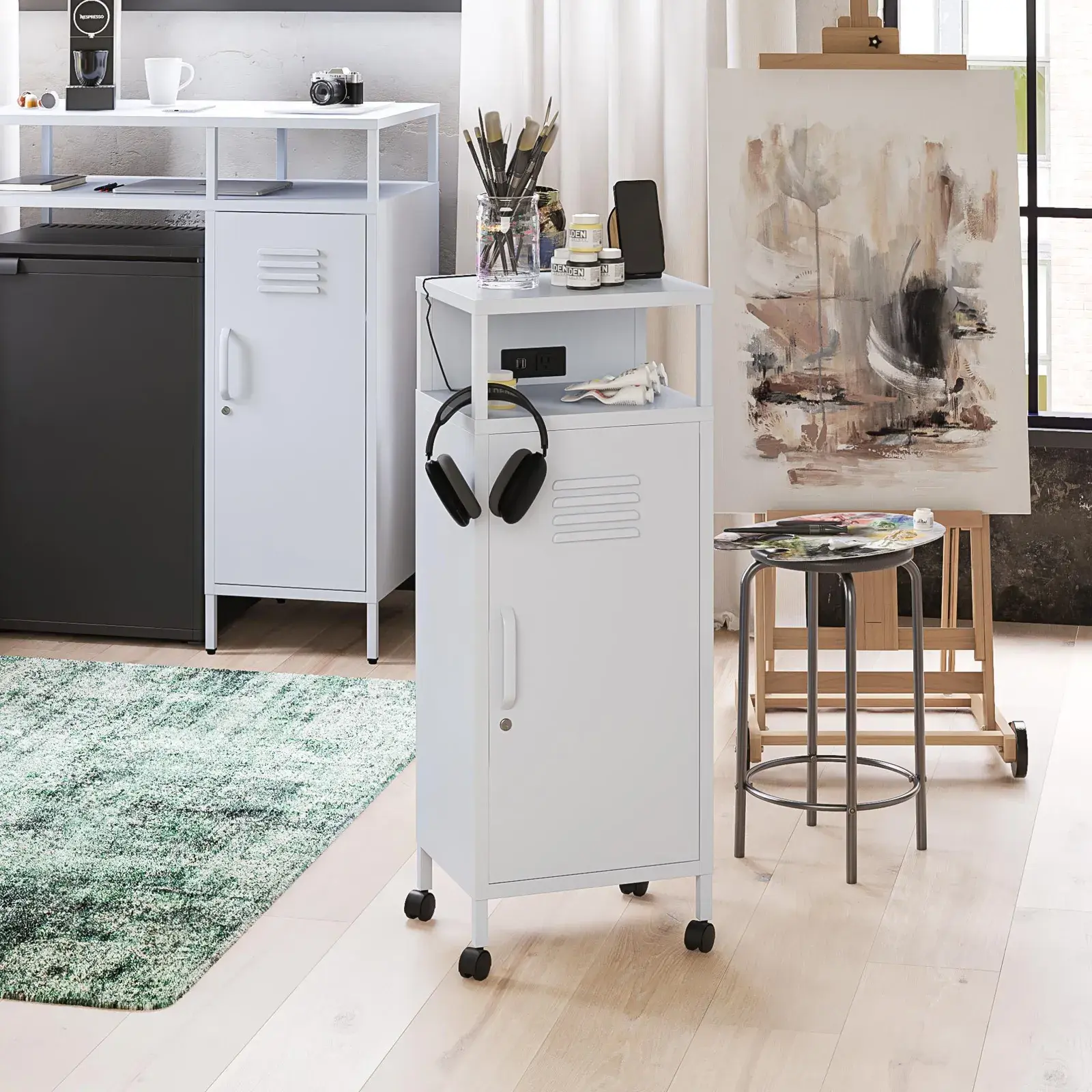 The Novogratz Cache Metal Locker-Style Rolling Cart is a versatile and multifunctional storage solution that combines style with practicality. Crafted from powder-coated steel, it boasts a retro locker design with ventilation--ideal for organizing your office, craft room, garage, laundry area, dorm room, or vanity. Lock away valuables using the included keys, and roll it effortlessly on locking casters. Plus, it features an integrated plug port and two USB-A ports for charging devices. Whether you need to store office supplies, secure personal items, or create a compact workstation, the Cache Rolling Cart has you covered. Choose from a variety of colors to match your décor.
