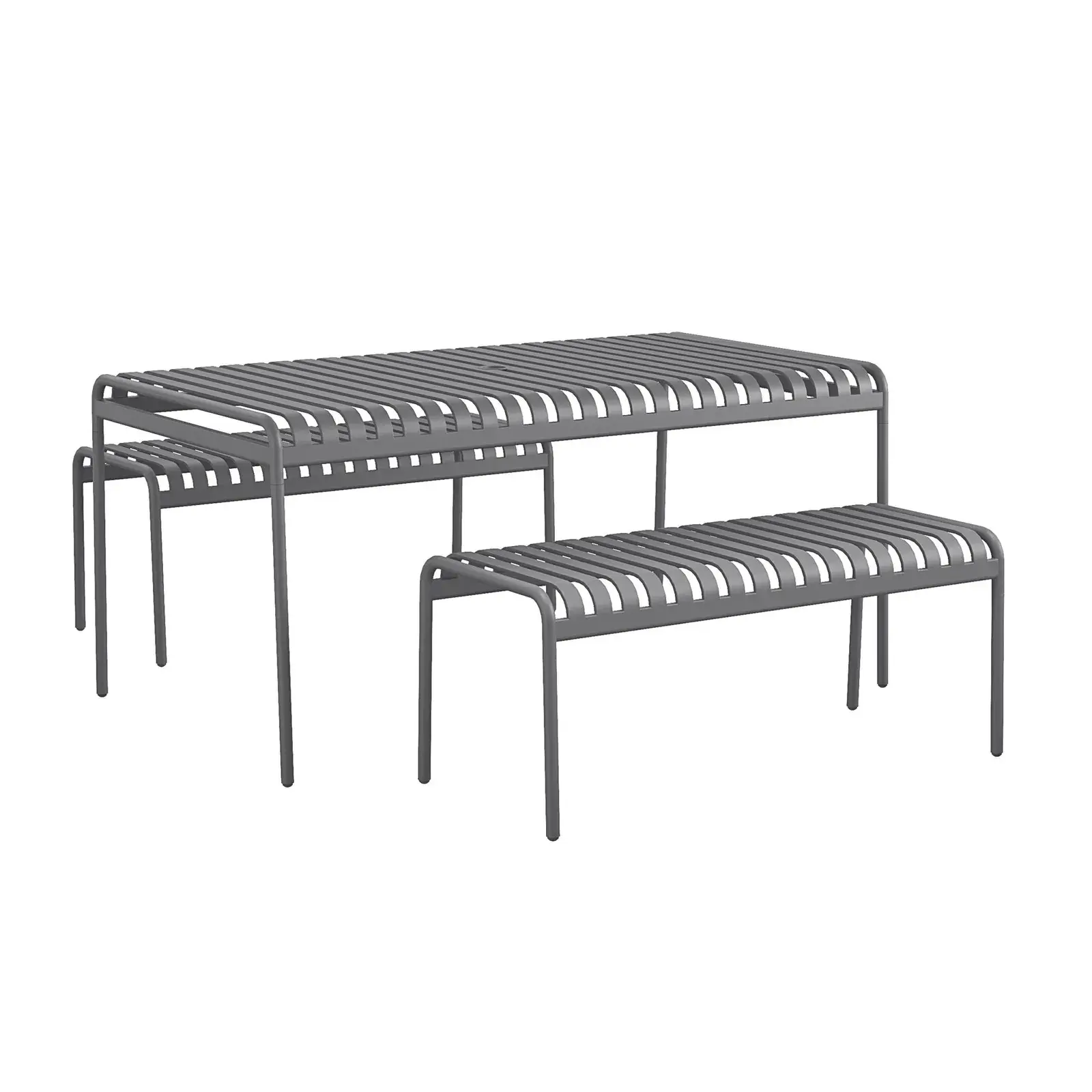 Ola loves entertaining, no matter the occasion! Whether it's a casual breakfast, a cozy dinner, or a fun barbecue, this 3 Piece Table and Bench Set by Novogratz is the perfect center piece. Ola features a sleek and sturdy steel construction made for entertainment and fun. The table and benches are easy to assemble without any tools, so you can start hosting your friends and family in no time. The table has an umbrella hole (umbrella not included) so you can enjoy some shade on sunny days. The benches can seat up to 4 people comfortably. It's perfect for both indoor and outdoor gatherings. With its linear and modern design, Ola will make your backyard, patio or dining room the place to be.